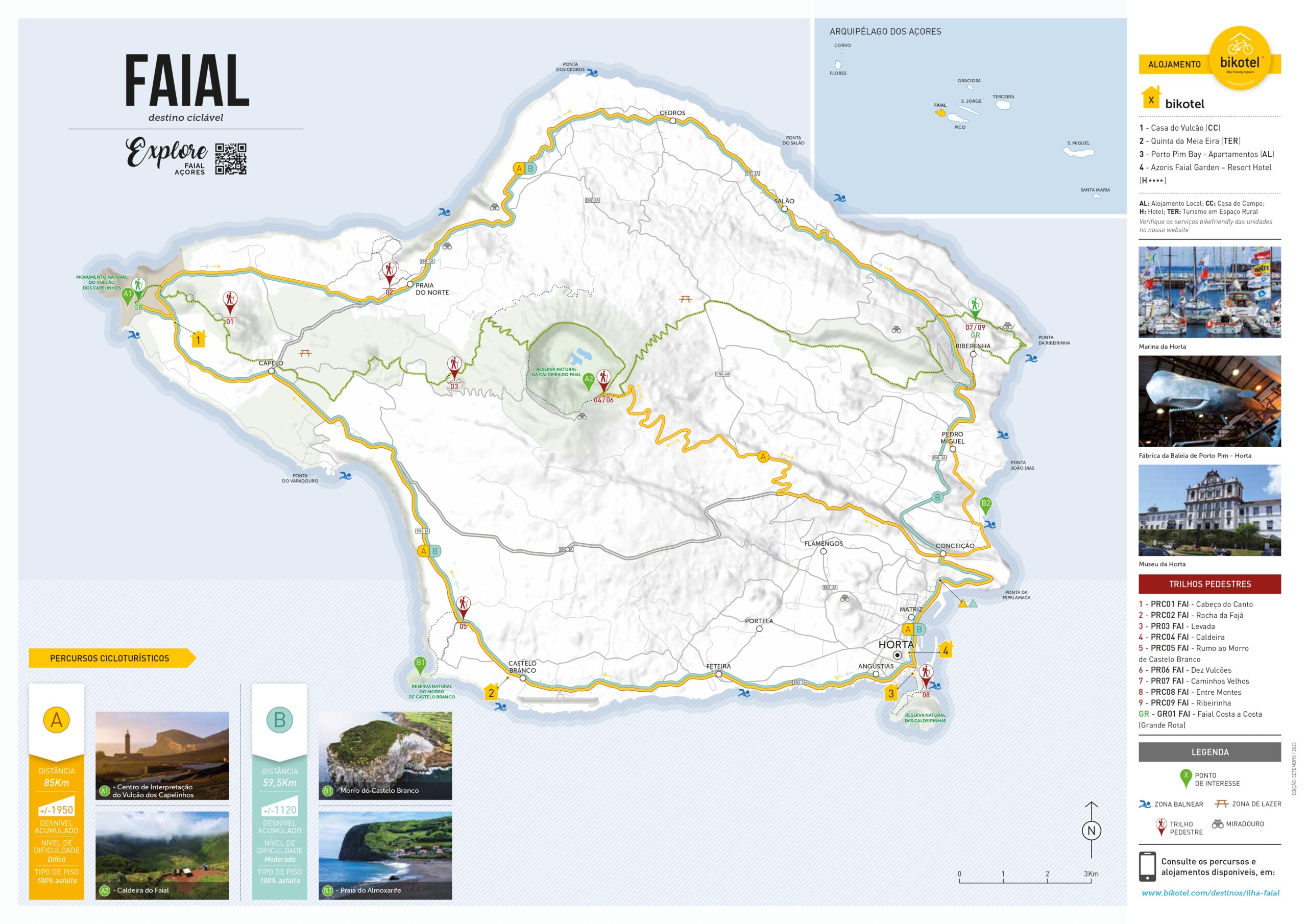 Aventure-se na Ilha do Faial, com 2 bikotels e 2 percursos que o levam a descobrir a sua paisagem vulcânica e o seu ambiente marítimo único. Desfrute de uma experiência autêntica de cicloturismo nesta ilha marcada pela sua história e natureza exuberante.