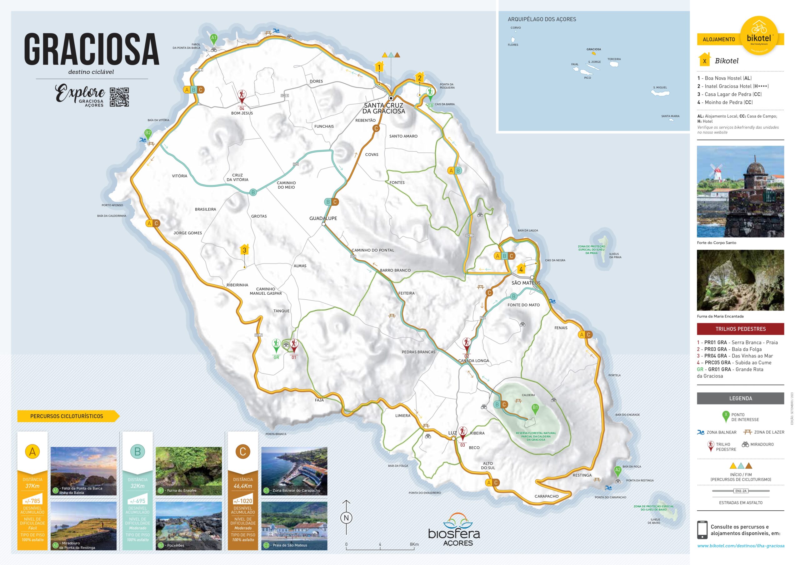 Explore a encantadora Ilha Graciosa, com 2 bikotels e 3 percursos que revelam a sua beleza tranquila e singular. Pedale pelos seus campos verdejantes, vilas pitorescas e costas recortadas, enquanto desfruta da hospitalidade bikotel neste refúgio açoriano.